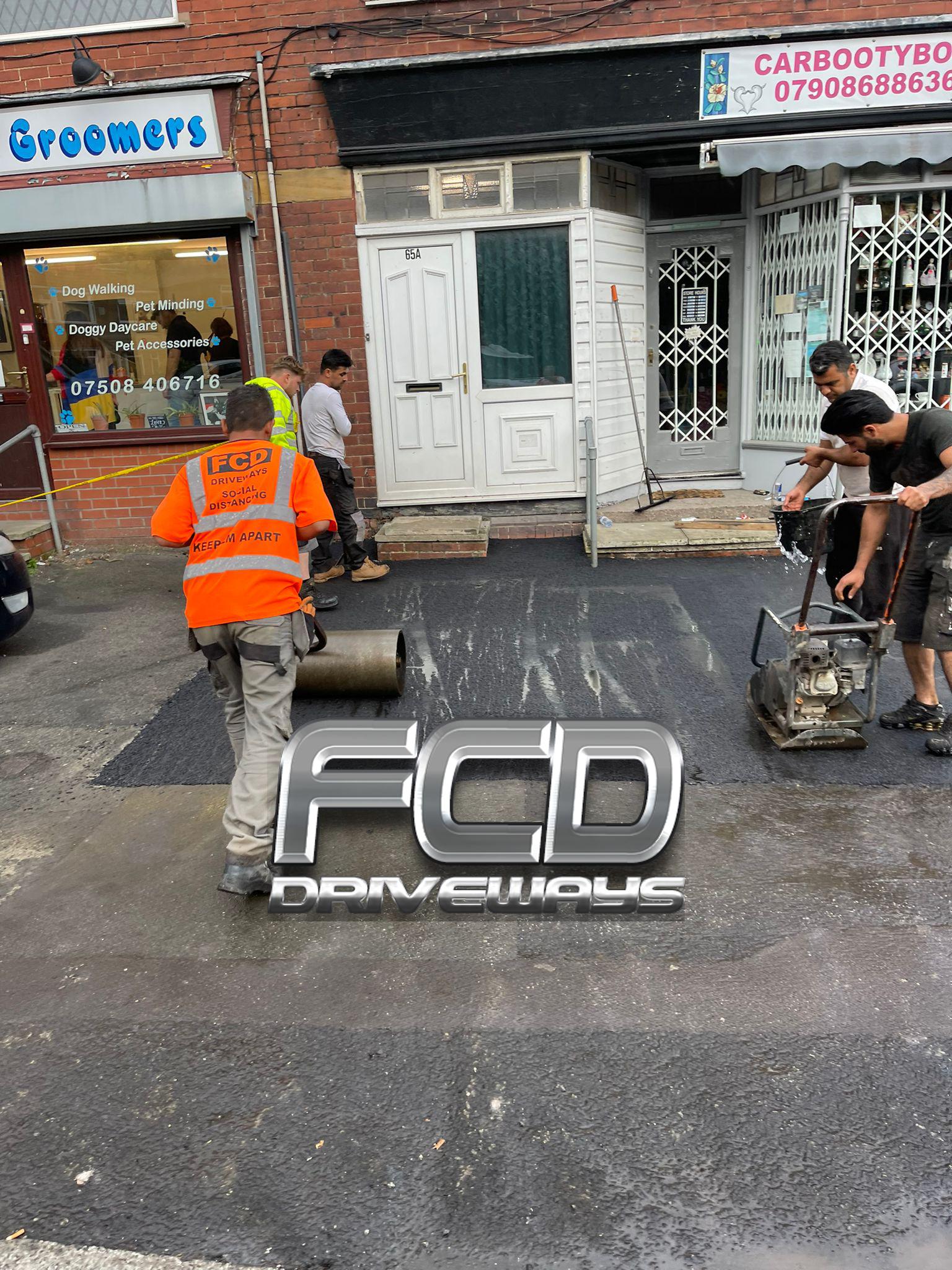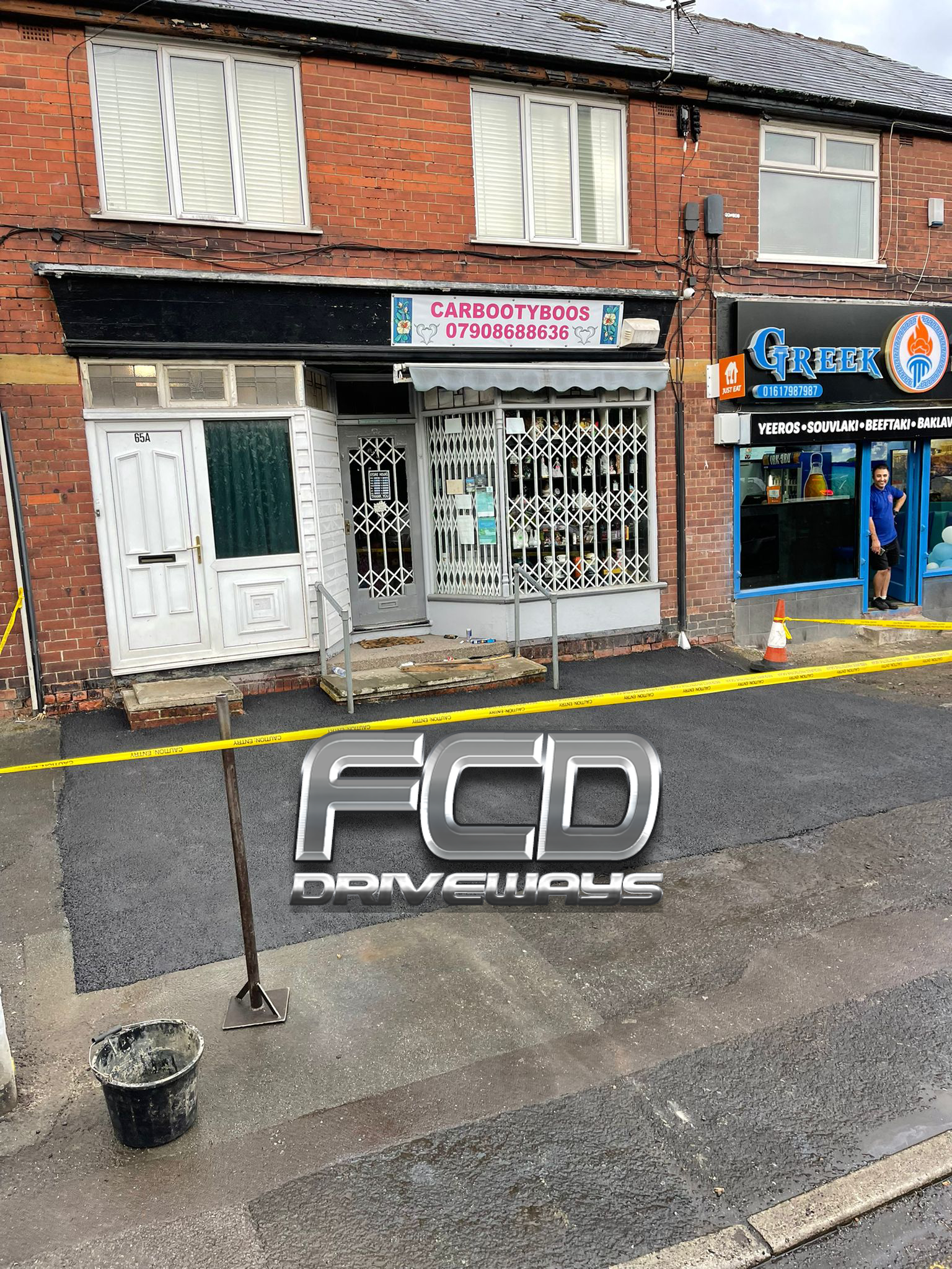 Complete transformation of a commercial shopfront old worn asphalt has been removed a new subbase installed compactor thoroughly with five ton roller and finished with 10 mil hard roll tarmac machine roll to a solid finish